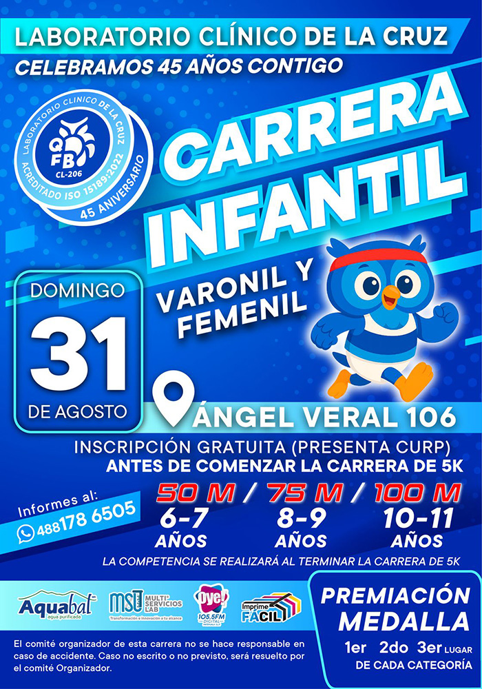 ¡Los más pequeños también son parte! Antes del evento principal, los niños podrán inscribirse para participar en su propia carrera, que se llevará a cabo al finalizar la competencia de adultos. Habrá categorías para niñas y niños, y se entregarán medallas a los tres primeros lugares de cada categoría.